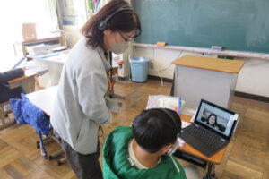 5・6年生のオンライン英会話が実施されました。フィリピン在住の方たちと1対1での対面式の学習でした。