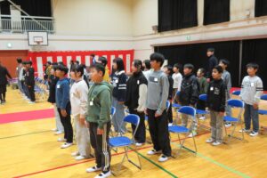 明日の卒業式本番を控え、最後の全体練習が行われました。呼びかけや歌、代表児童との動きの練習が行われました。