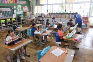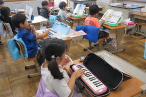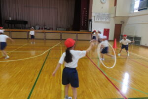 1・2年生の授業の様子です。1年生は音楽で、「メリーさんの羊」を鍵盤ハーモニカで演奏しました。2年生は体育で、フラフープを転がして相手チームに当てるゲームをしました。みんな上手にフラフープを転がしたり、それをよけたりしました。みんなが仲良く学習や生活をしています。