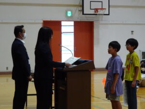 表彰式、新任の図書支援員の紹介、令和7年度前期の終業式が行われました。