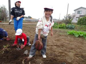 わくわく隊(縦割り班)による、サツマイモの収穫が行われました。春にわくわく隊で植えたサツマイモの苗。約半年が過ぎ、たくさんのイモが収穫できました。中には顔くらいの大きさのものも。