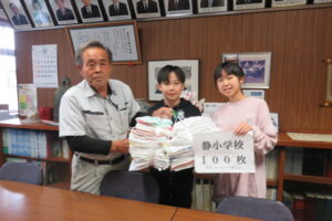 境町いきいきクラブ連合会の皆様から、手作り雑巾の寄贈が行われ、6年生が代表で受け取りました。 今年もたくさんの雑巾をいただきありがとうございます。有効に活用させていただきます。